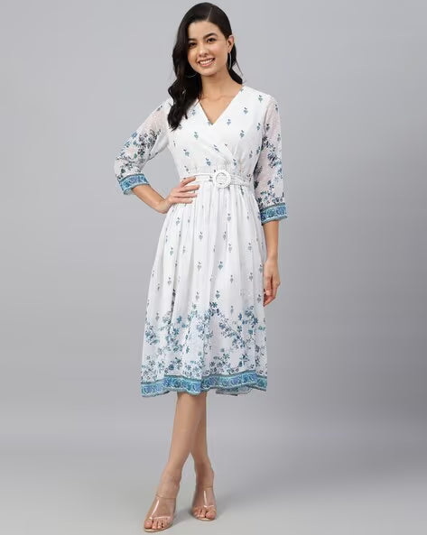 White Georgette Digital Print Flared Western Dress